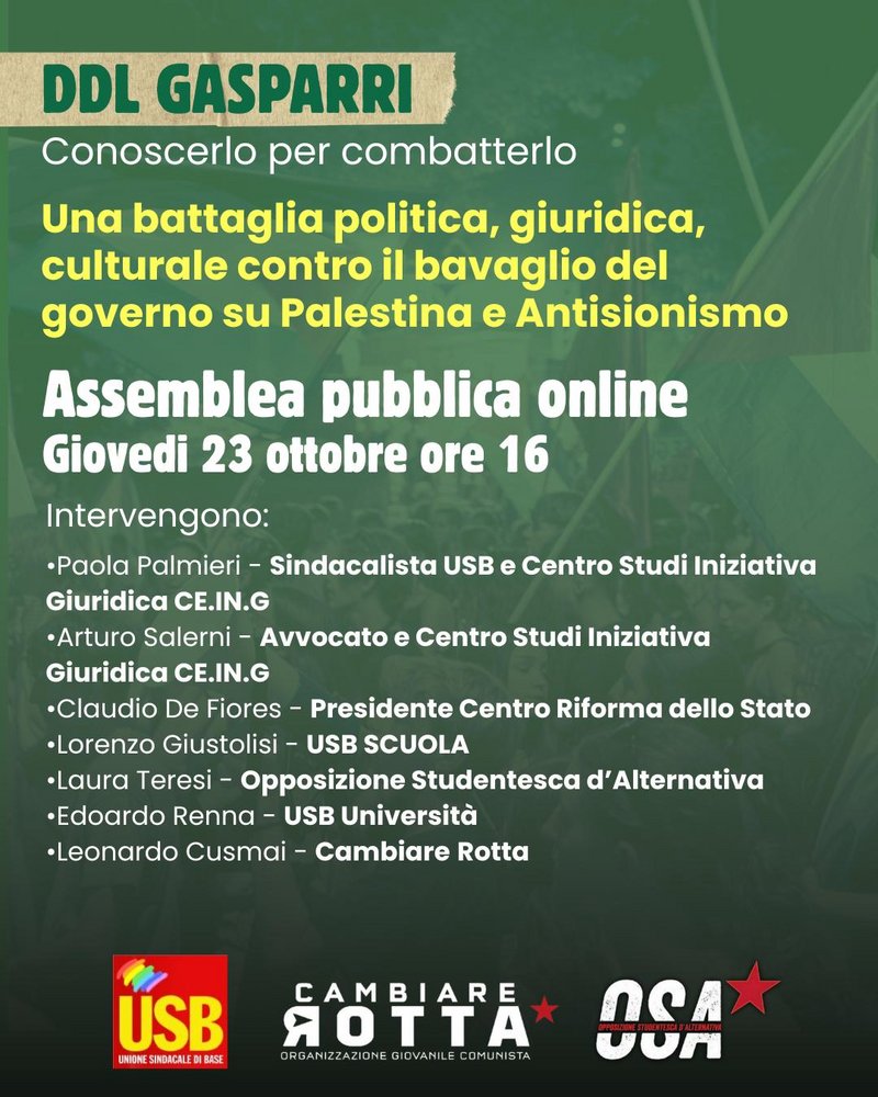 Giovedì 23 ottobre alle ore 16 organizziamo un’assemblea pubblica online per smontare, punto per punto, il Disegno di Legge che prova a mettere il bavaglio a chi sostiene la Palestina e pratica l’antisionismo come critica politica e storica. Non è solo una questione giuridica, ma una battaglia politica, culturale, sociale e sindacale per difendere libertà di espressione, diritto di critica, di assemblea e di mobilitazione nei luoghi di studio e di lavoro.