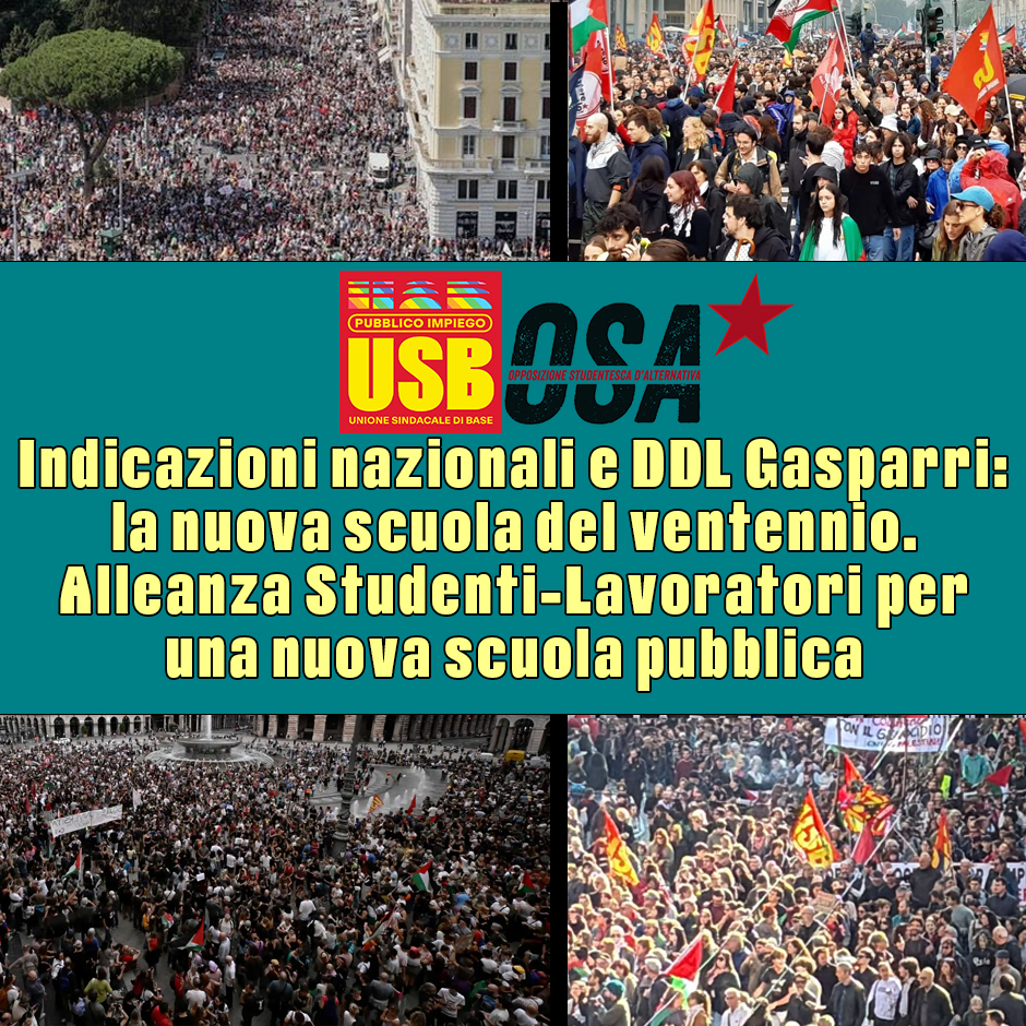 Quello di Gasparri non è solo un DDL che silenzia le proteste e la libertà di espressione, ma impone un revisionismo storico che deve permeare profondamente il corpo sociale del Paese, come già chiaramente evidenziato dalle Indicazioni Nazionali in cui con le tre parole d’ordine Bibbia, Latino e alfabetizzazione digitale, si vuole in realtà stabilire un focus chiaro su una storia occidentale, ormai in crisi dentro il mondo multipolare, declinata attraverso cristianità, romanità, individualismo. I fantomatici valori dell’Occidente, tanto cari a Valditara e Galli della Loggia, li abbiamo visti a Gaza, con la complicità inequivocabile delle cancellerie occidentali con il genocidio perpetrato da Israele. Le tantissime occupazioni di questi giorni, sostenute dall’Osa e appoggiate da USB, sono un grido degli studenti e delle studentesse contro questa contraddizione stridente, fra l’immagine che il nostro pezzo di mondo si vuole dare e le barbarie che produce.