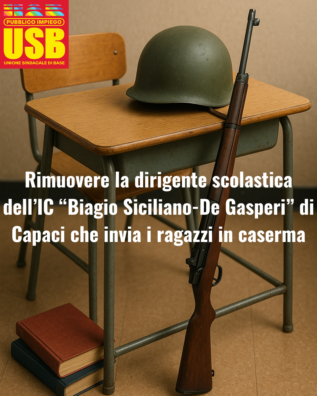 In queste ore ha destato molto scalpore il comunicato dell’USB Scuola Palermo che denuncia la decisione autonoma della dirigente scolastica dell’IC “Biagio Siciliano-De Gasperi” che invia gli studenti e le studentesse delle classi terze in attività di orientamento presso la Caserma Turba di Palermo. Una visita che non ha visto alcun pronunciamento del collegio docenti o del consiglio d’istituto, di cui la quasi totalità di docenti e genitori ha saputo tramite una semplice circolare, in violazione del regolamento d’istituto della scuola e del PTOF che prevede che l'attività di orientamento possa essere svolta solo presso presso le scuole superiori del terriorio (nel pieno rispetto dell’obbligo scolastico).