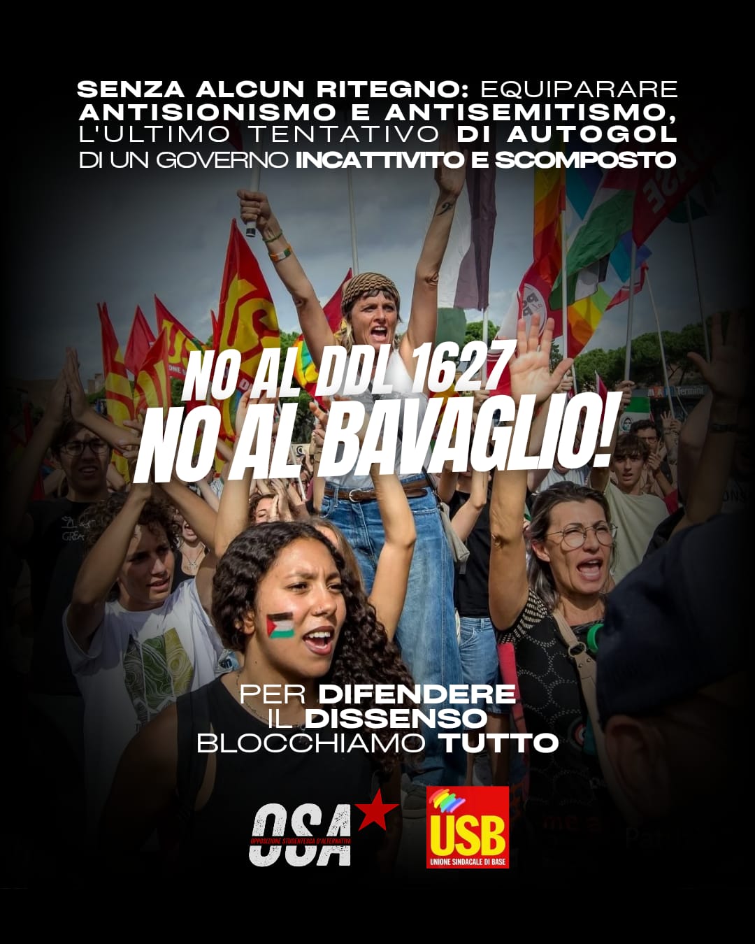 USB Scuola e OSA sono molto chiare: c’è da combattere una battaglia culturale durissima, a partire da scuole e università, perché il sionismo è ammesso e praticato a tutti i livelli del nostro paese, aumentando giorno dopo giorno in intensità e violenza.Se il Governo attacca il dissenso, imprimendo questa nuova svolta autoritaria alla scuola, noi siamo pronti a ribloccare tutto, a partire dai nostri istituti. L’alleanza fra studenti e lavoratori della scuola che stiamo promuovendo è pronta a organizzarsi e mobilitarsi a difesa della democrazia nelle scuole e per il blocco di questo Ddl1627.Non ci metterete il bavaglio! Se ci proverete, bloccheremo tutto! Ancora una volta!