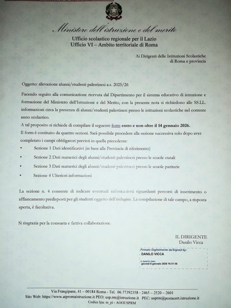 Oggi, invece, il Ministero chiede alle scuole di identificare e contare studenti palestinesi senza alcun progetto educativo dichiarato, senza risorse aggiuntive, senza un quadro normativo trasparente e senza tutele chiare.