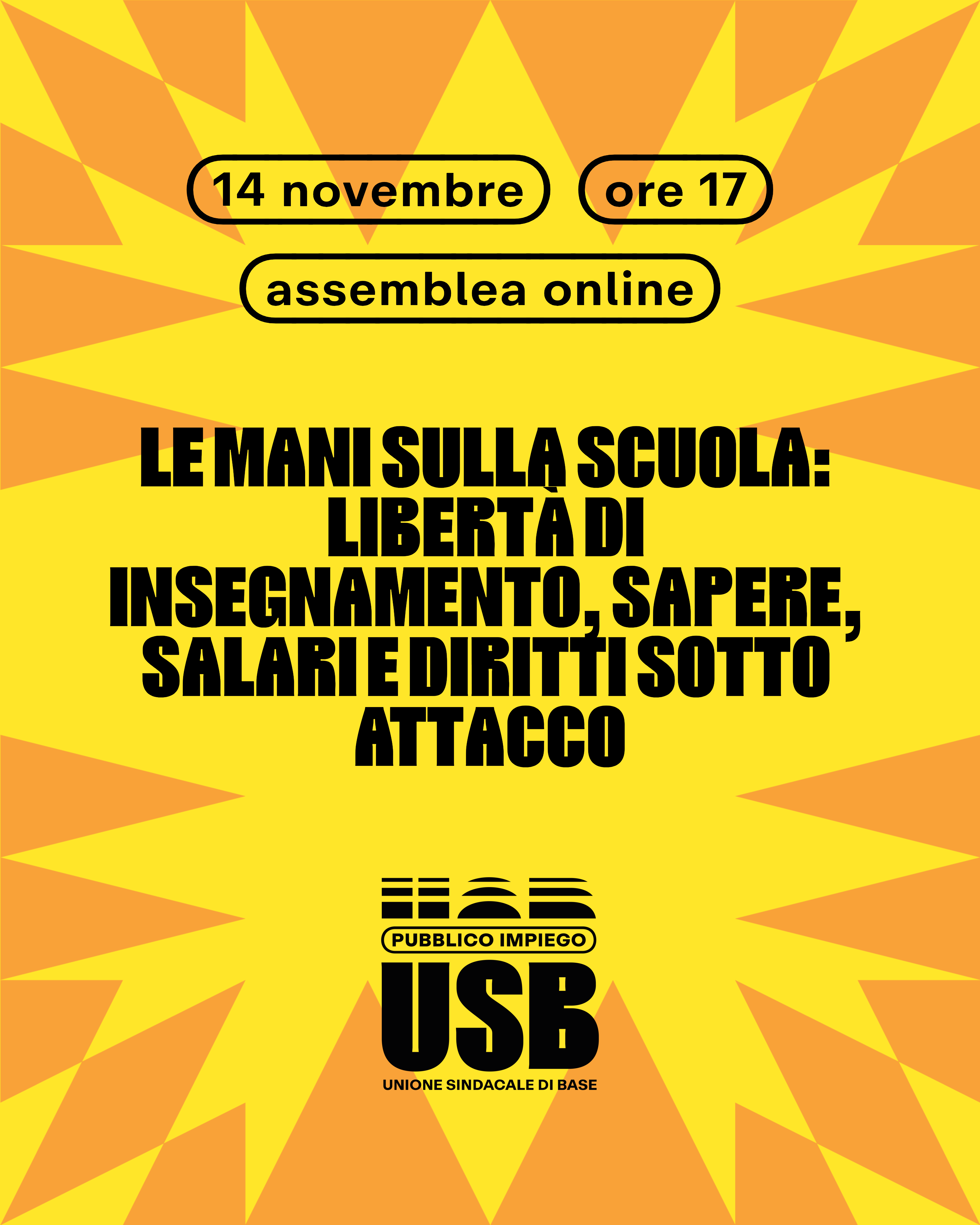 Proprio nel pomeriggio del 14 terremo la nostra assemblea intitolata “Le mani sulla scuola” e, insieme ai giovani di OSA e Cambiare Rotta, valuteremo l'impatto di questa controriforma permanente della nuova scuola capitalista su lavoratori e studenti. L’assemblea sarà trasmessa in streaming sul sito scuola.usb.it e al link